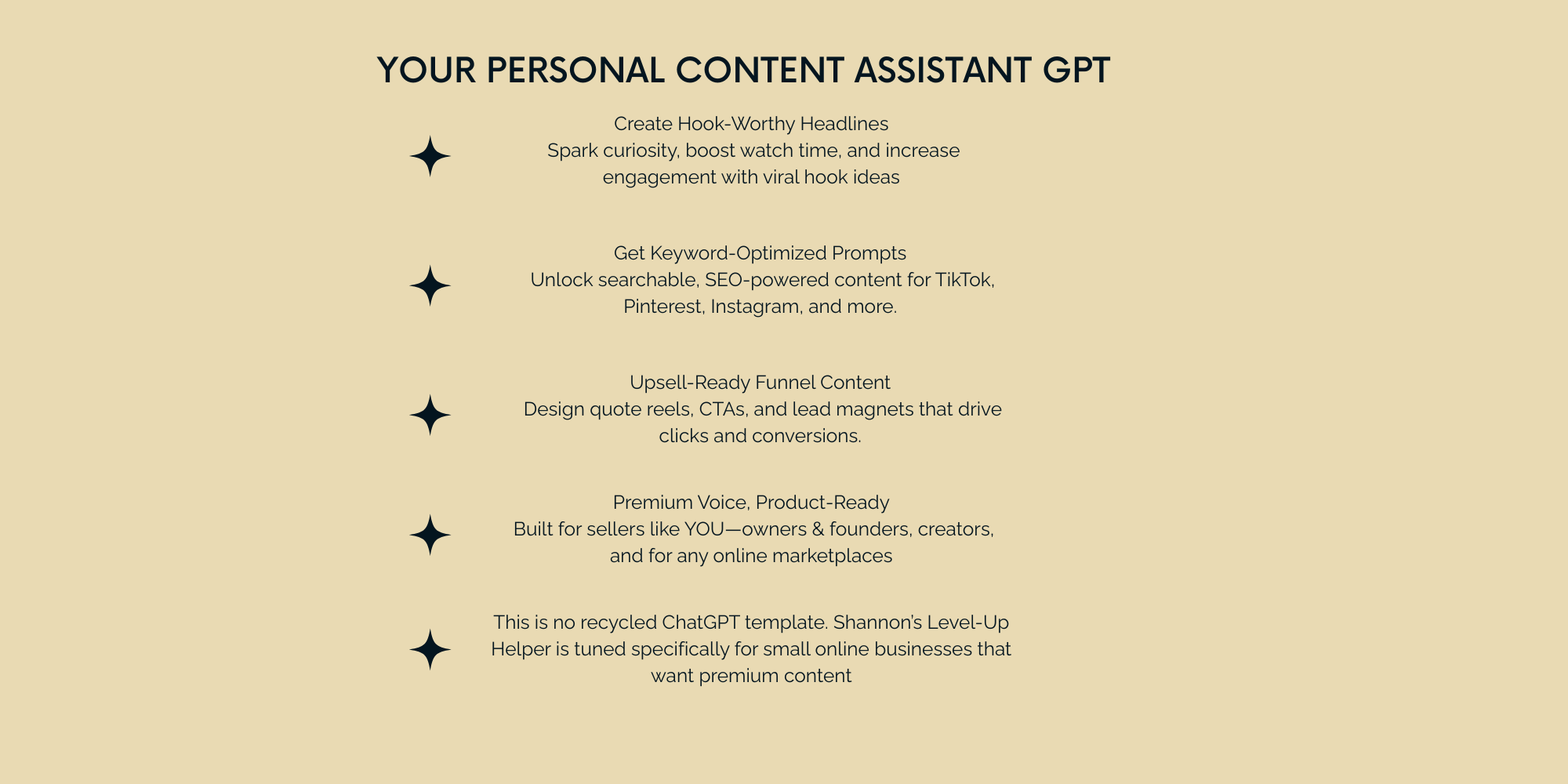 Shannon’s Level-Up Helper is a customized GPT designed to help you sell your products smarter and faster. From writing captions and hooks to generating keywords and CTAs, it’s built to keep your storefront growing while saving you hours of work.