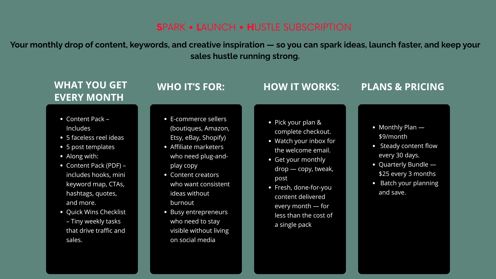 Your monthly drop of content, keywords, and creative inspiration — so you can spark ideas, launch faster, and keep your sales hustle running strong.
